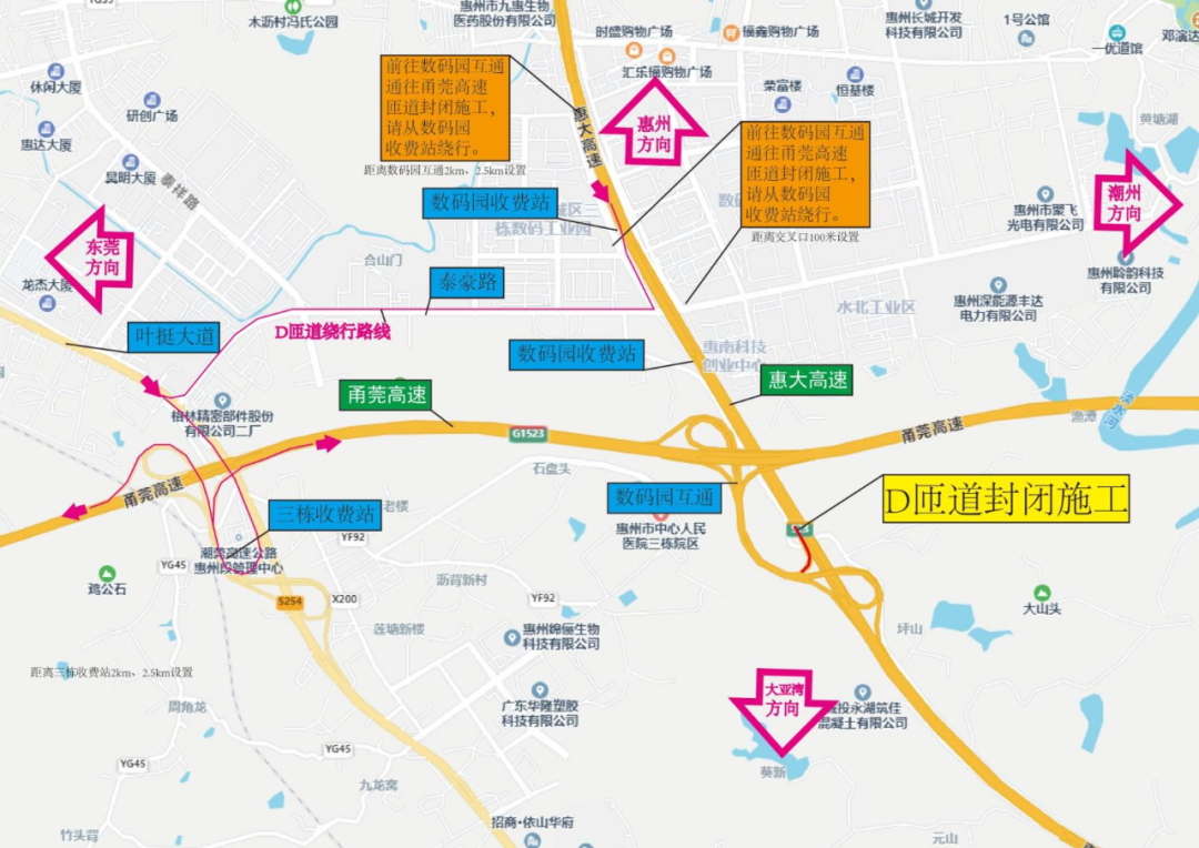(一)數(shù)碼園互通D匝道:由2025年8月18日10:00延至2025年8月25日18:30,惠大高速公路(往大亞灣方向)接入甬莞高速公路(往東莞、汕頭方向)的匝道封閉,禁止車輛通行。(見(jiàn)圖1)