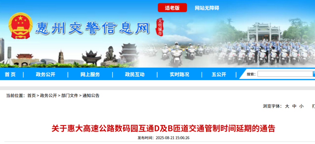 受近期降雨天氣影響,S23惠大高速公路數(shù)碼園互通D及B匝道路面、防撞護(hù)欄提升改造工程施工還未完工,需要延期。為確保施工期間道路交通安全有序,根據(jù)《中華人民共和國(guó)道路交通安全法》等有關(guān)法律法規(guī),現(xiàn)將相關(guān)交通管制時(shí)間延期情況通告如下: