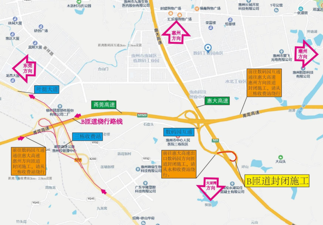 (一)惠大高速(往大亞灣方向)通往甬莞高速(往東莞、汕頭方向)的車輛,可選擇提前從數(shù)碼園收費(fèi)站下高速后繞行泰豪路及葉挺大道從三棟收費(fèi)站駛?cè)腽父咚?東莞、汕頭方向)。