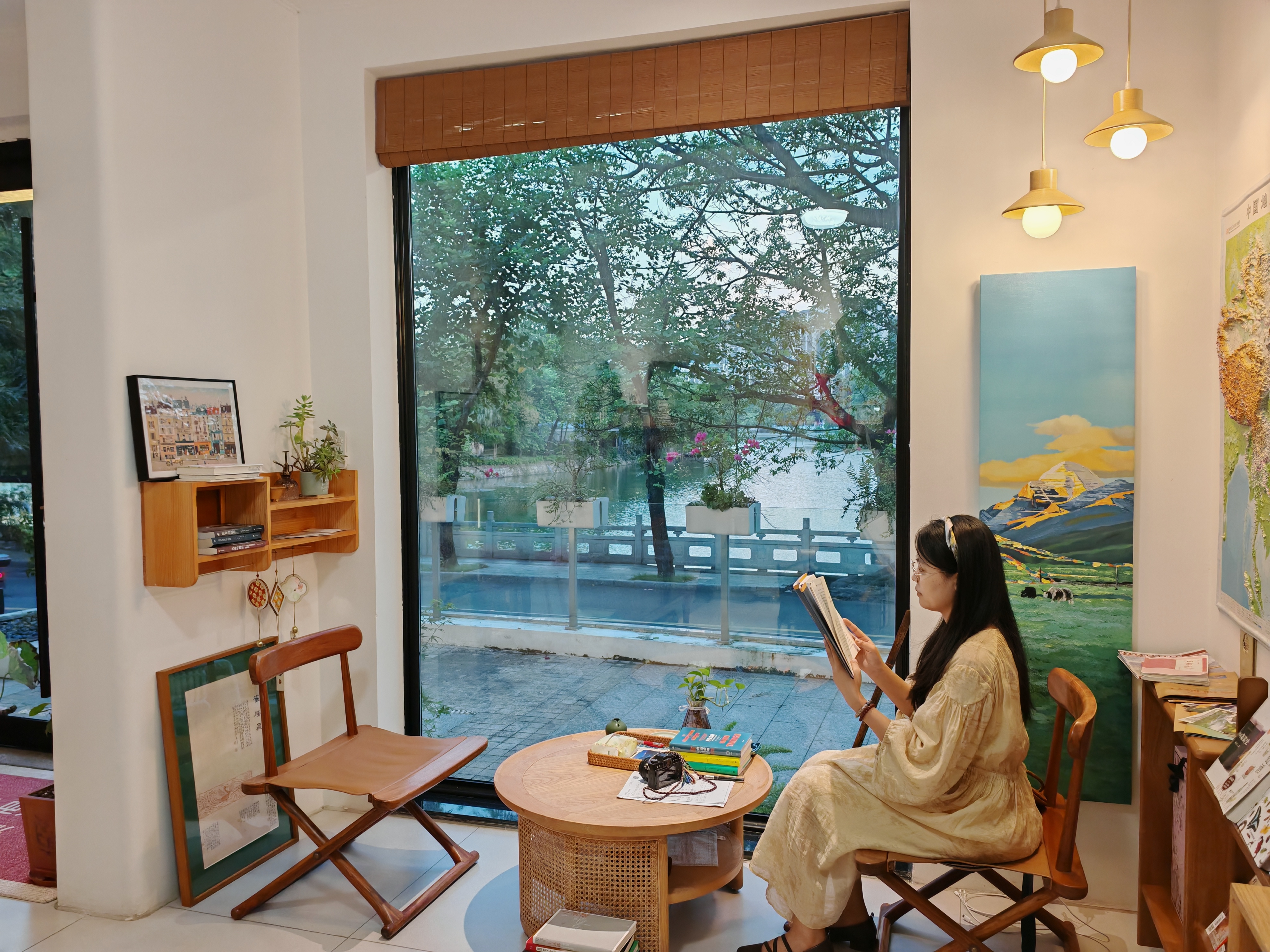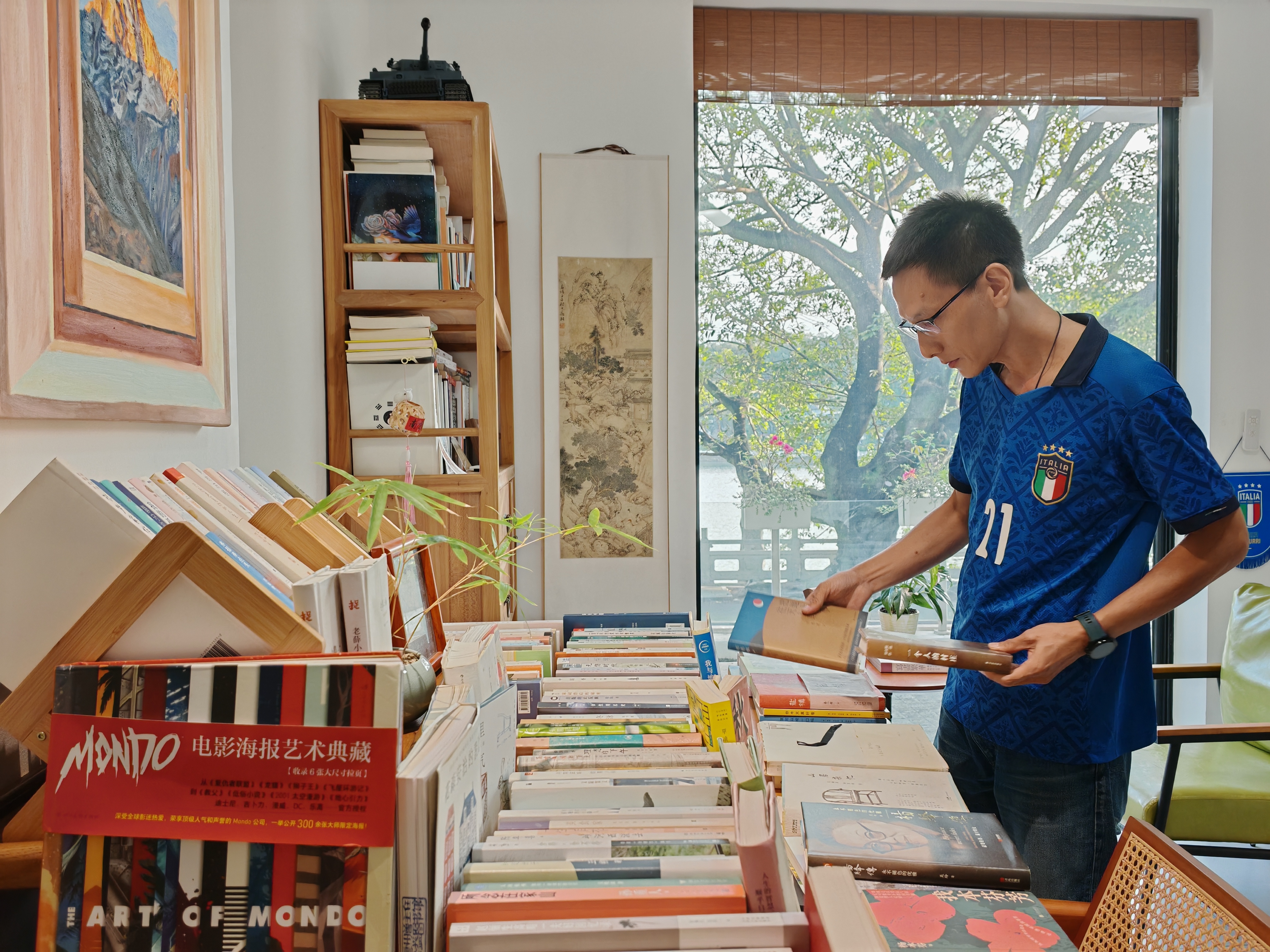 下午四時(shí)的陽光透過玻璃窗,輕柔地灑滿“圖書館”。讀者們靜靜翻閱書籍,偶爾啜一口免費(fèi)提供的咖啡或茶。館內(nèi)書本、裝飾物擺放別具意趣,墻上掛畫氛圍十足,營造出一方遠(yuǎn)離喧囂的文化凈土。