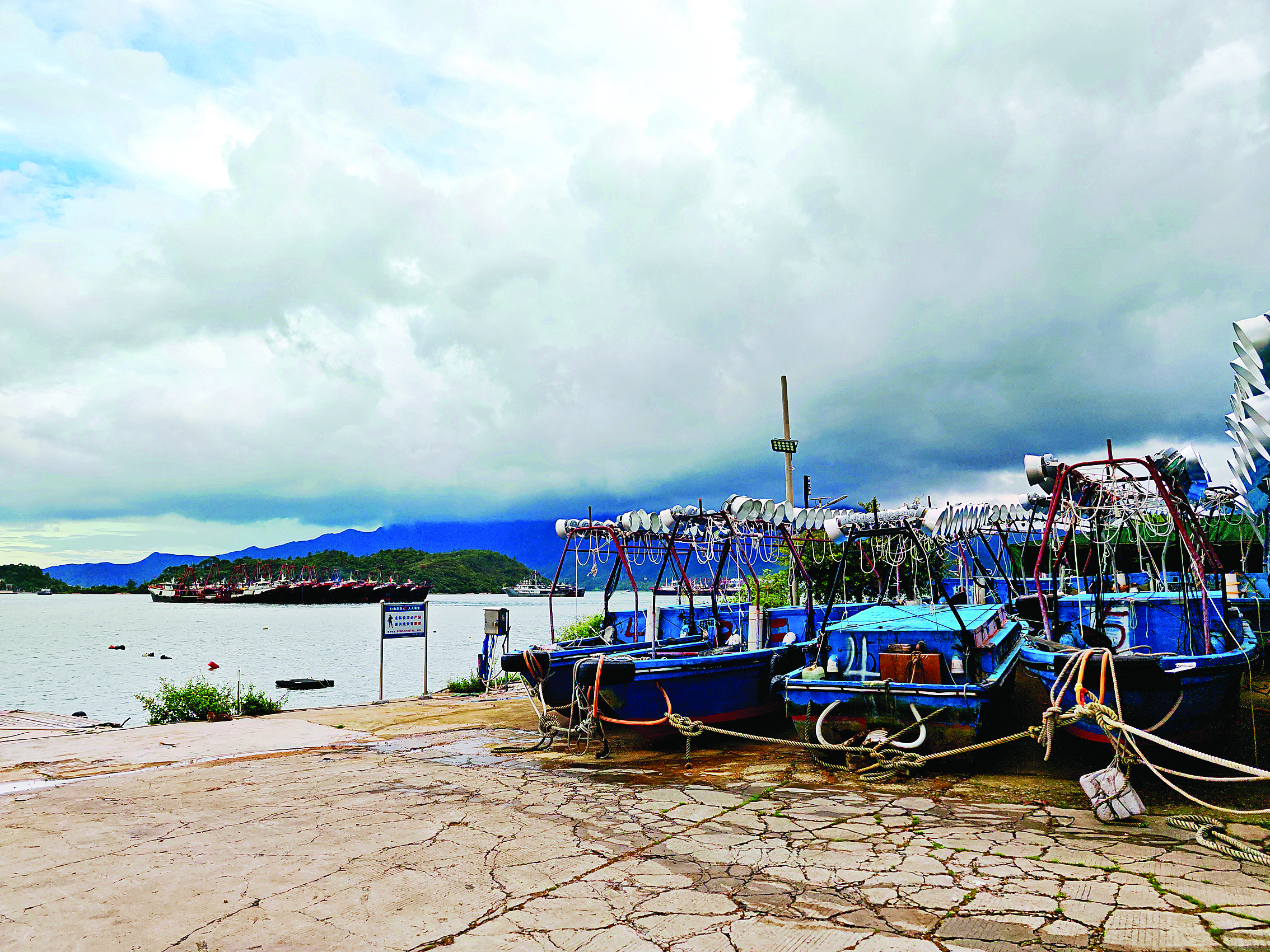 9月21日下午5時許,在大亞灣澳頭小桂,大型漁船已回港避風(fēng),小型漁船已經(jīng)吊到岸上。惠州日報記者匡湘鄂 攝