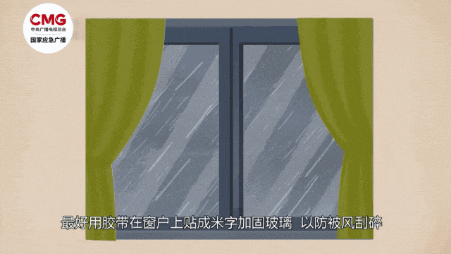 2. 關(guān)緊門窗,在窗戶上用寬膠布貼成“米”字,加固玻璃,以防被風(fēng)吹破傷人。