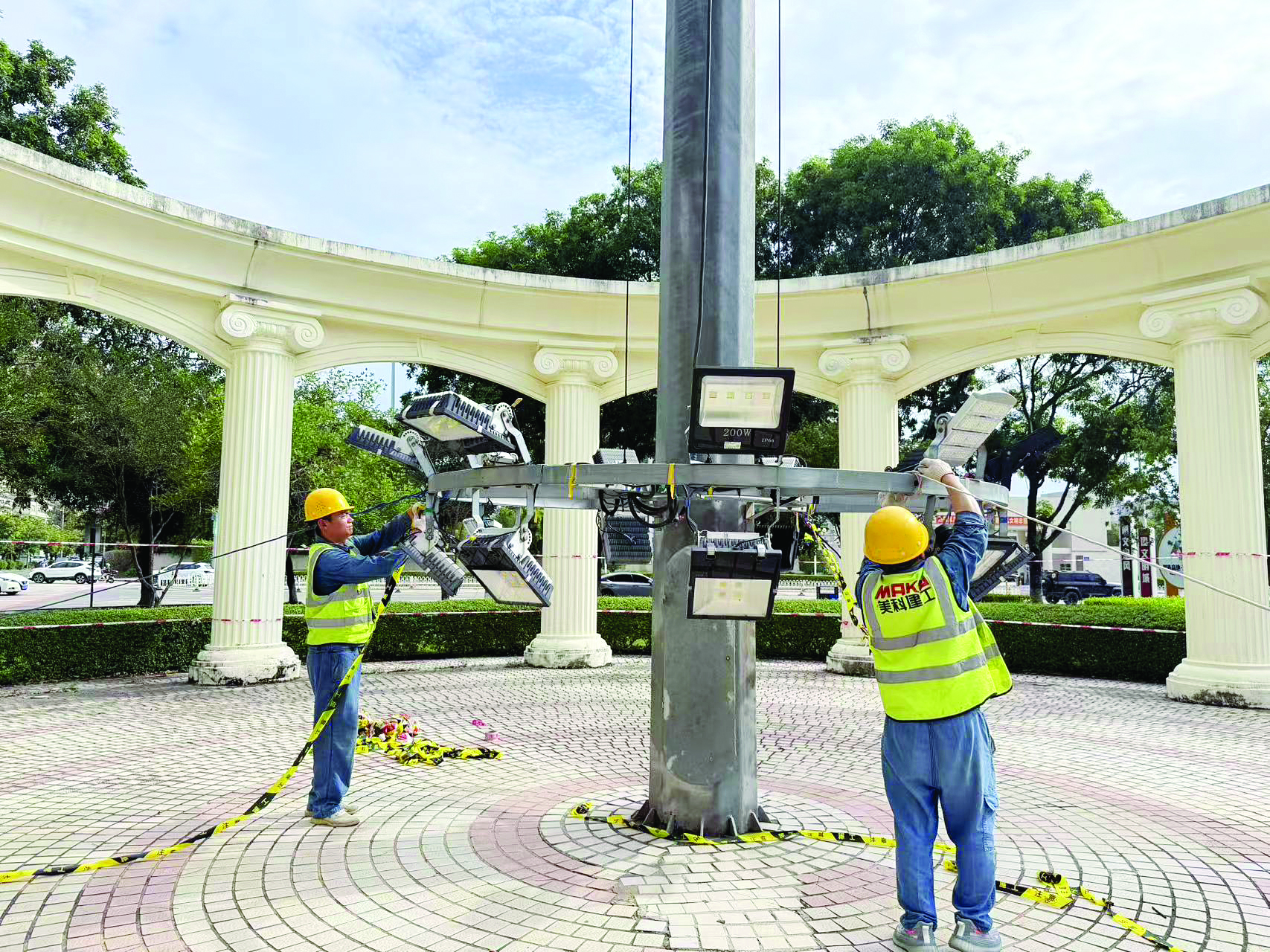惠陽區(qū)應(yīng)急人員臨時下降高桿燈,防范燈體墜落。 惠州日報記者李芳娟 通訊員葉宏輝 攝