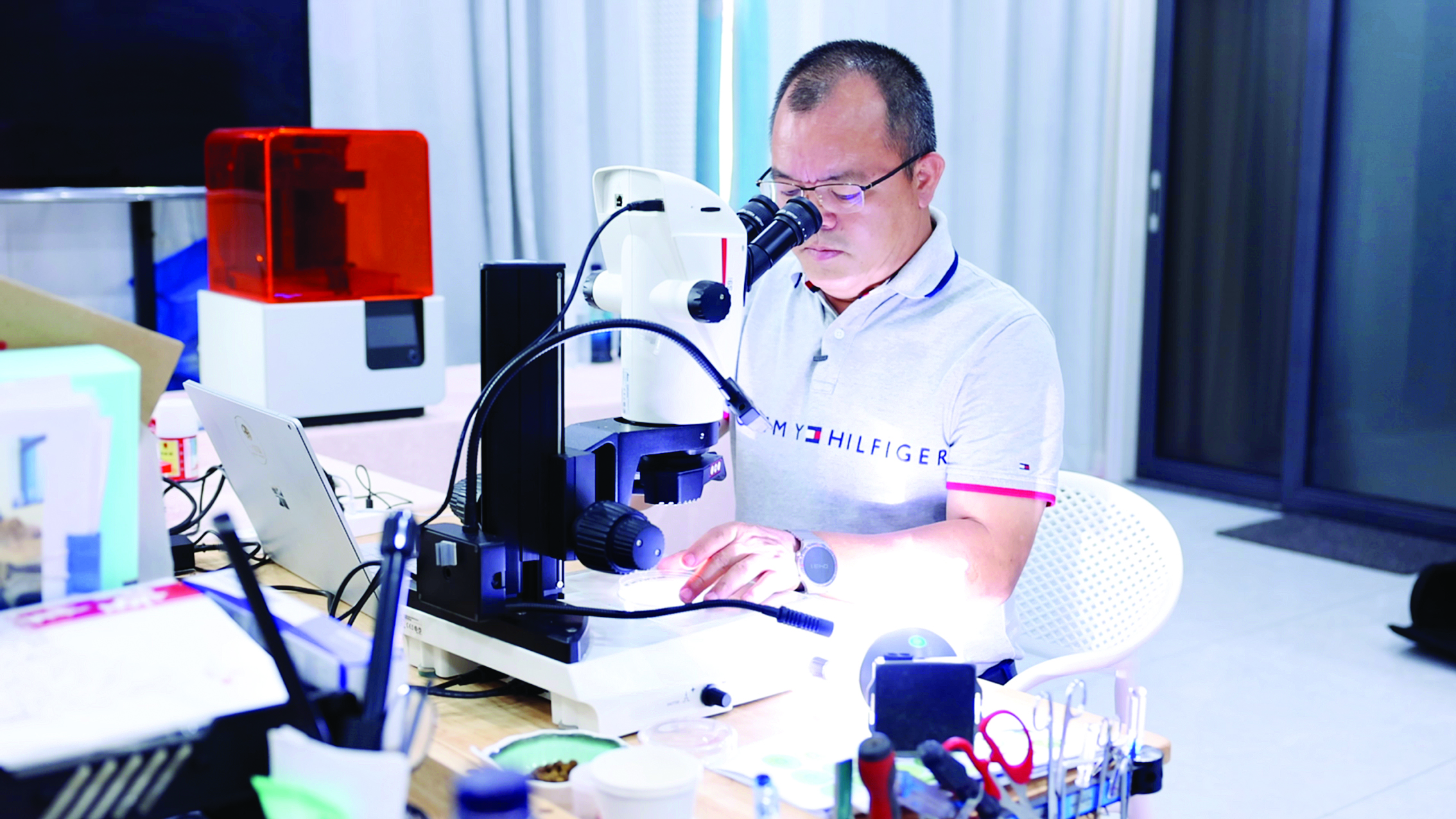顏闊秋通過顯微鏡觀察受精卵。