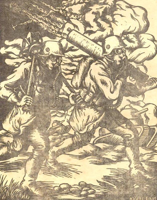 抗戰(zhàn)時(shí)期,惠州版畫家梁永泰創(chuàng)作的《冒著敵人的毒氣前進(jìn)!》,記錄了日寇發(fā)動(dòng)毒氣戰(zhàn)的罪行。侯縣軍翻拍
