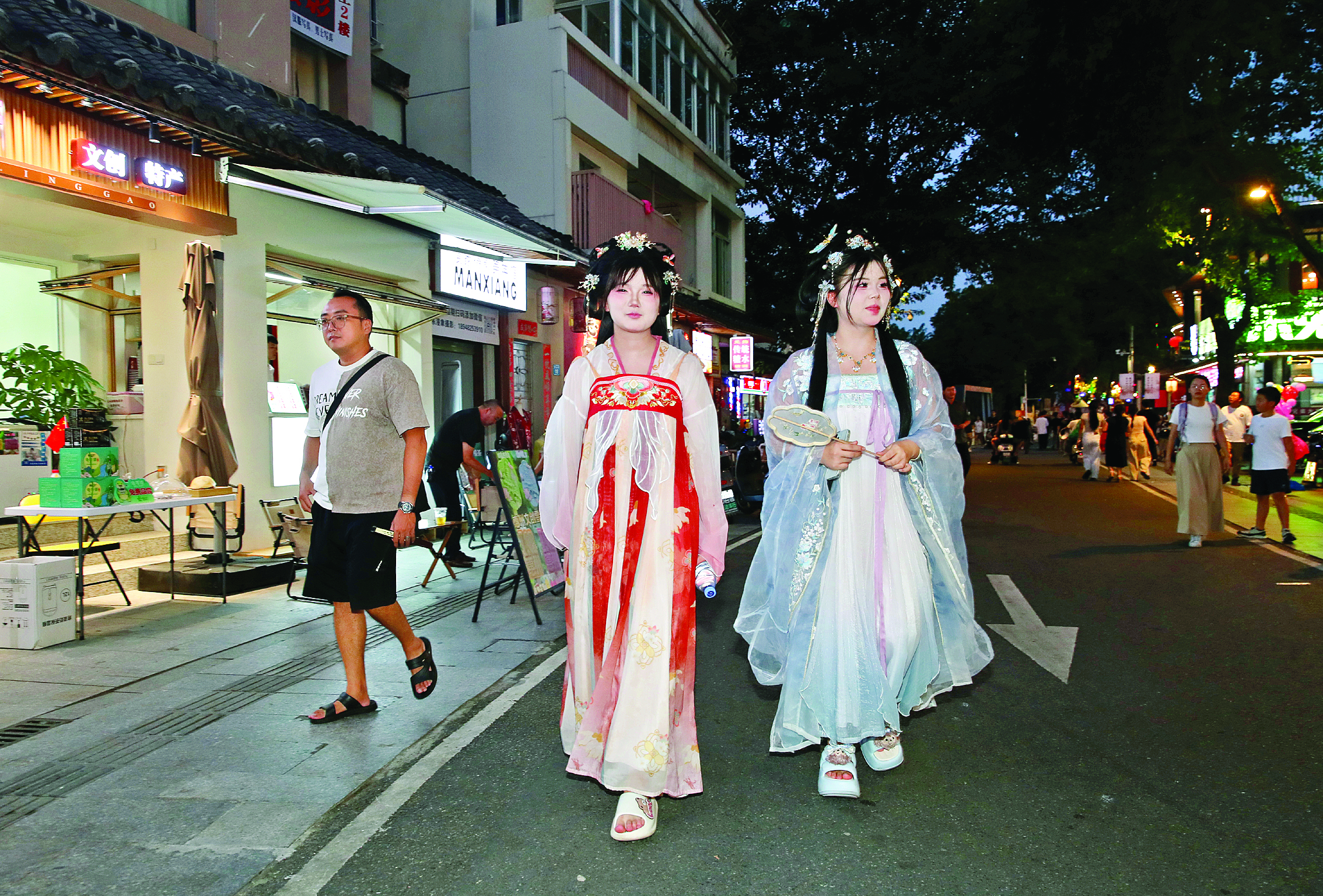 這里早已成為文藝青年的聚集地,游人穿梭于古今之間。10家漢服妝造室提供從妝造、攝影到后期的一條龍服務(wù),身著漢服的游人衣袂翩躚,與古巷月光相映成趣,宛如穿越千年的邂逅。沉浸式體驗(yàn)讓游客與歷史文化親密接觸。