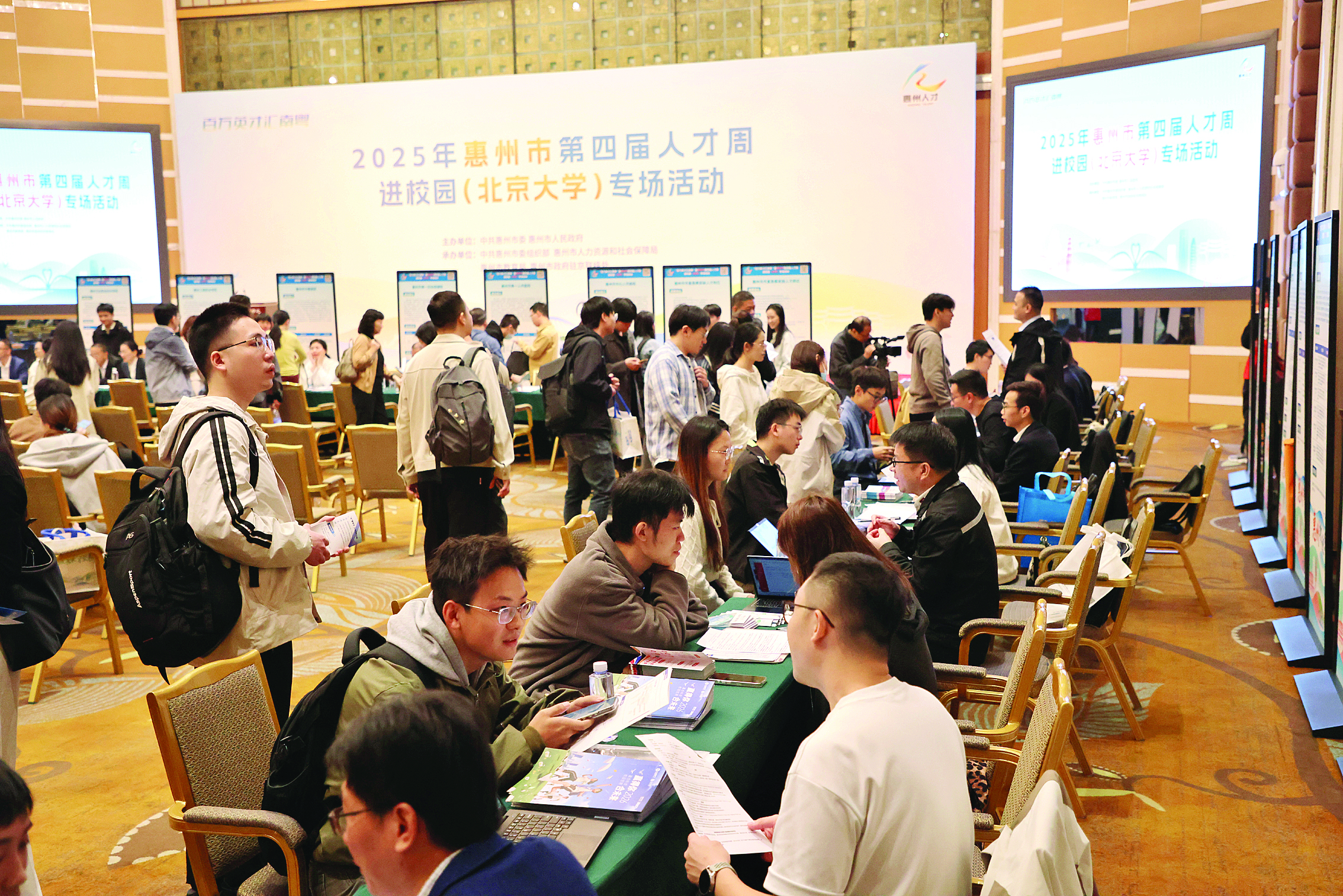 10月15日,由市委、市政府主辦,市委組織部、市人力資源和社會保障局、市教育局、市政府駐京聯(lián)絡處承辦的“百萬英才匯南粵”暨2025年惠州市第四屆人才周進校園(北京)專場活動走進北京大學。圖為我市民營企業(yè)招聘的崗位受到了北大學子的青睞。惠州日報記者王建橋 攝