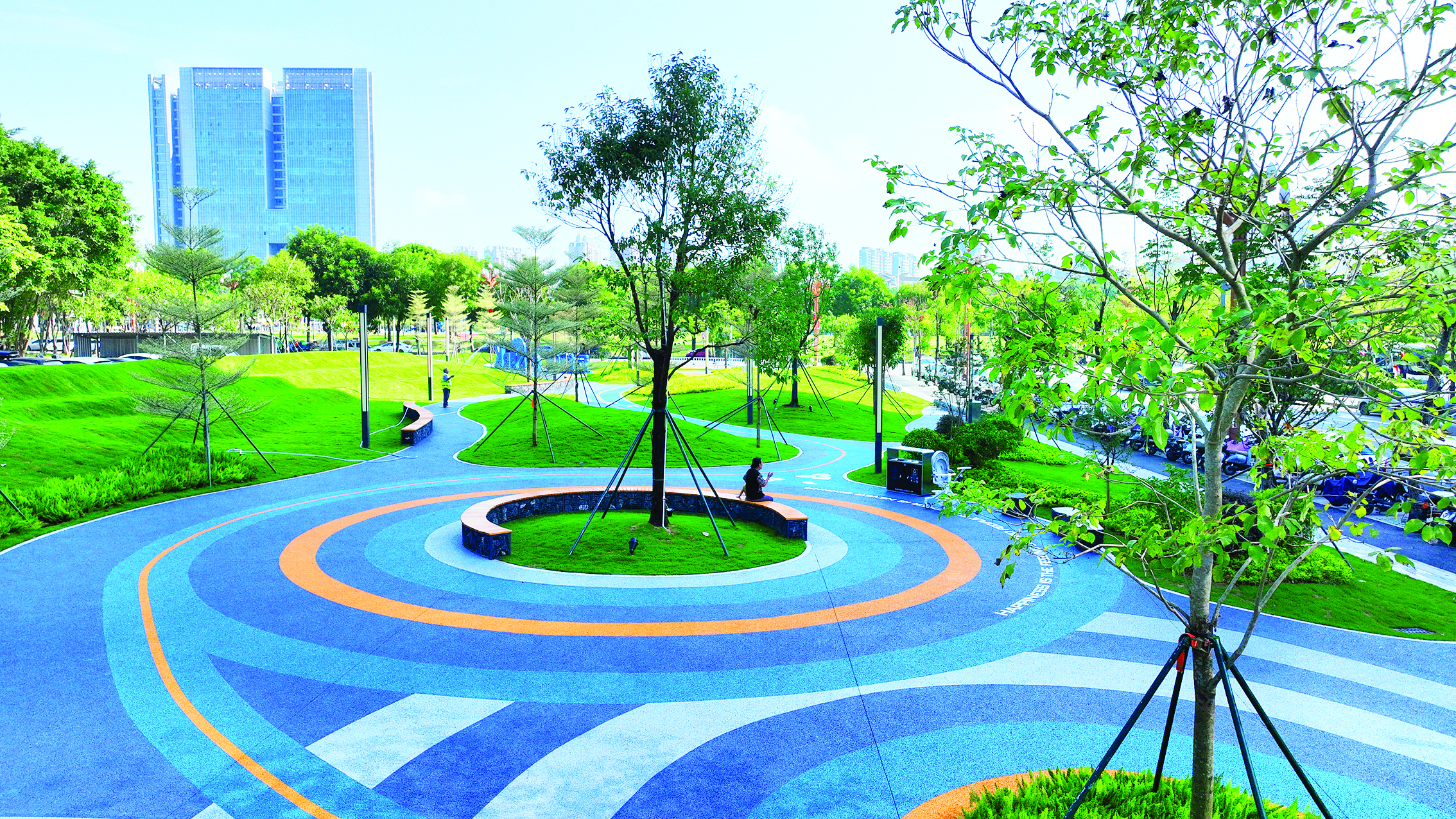 公園內(nèi),以防滑耐磨的透水混凝土材質鋪設的無障礙活力步道如同紐帶般串聯(lián)起整個場地,不僅滿足了市民的運動需求,更保障了老年人、殘疾人等群體的無障礙通行,真正實現(xiàn)“運動不分年齡,休閑沒有門檻”。