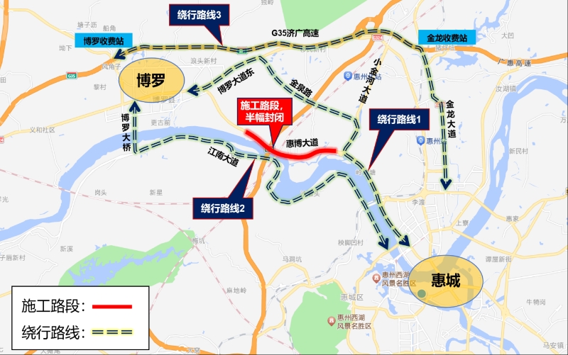 為避免施工期間帶來的交通擁堵,影響出行行程,惠州交管部門建議,博羅羅陽往返惠城的車輛,盡量選擇通過博羅大道東-金泉路-小金河大道、博羅大橋-江南大道、博羅收費(fèi)站-G35濟(jì)廣高速-金龍收費(fèi)站等線路繞行。