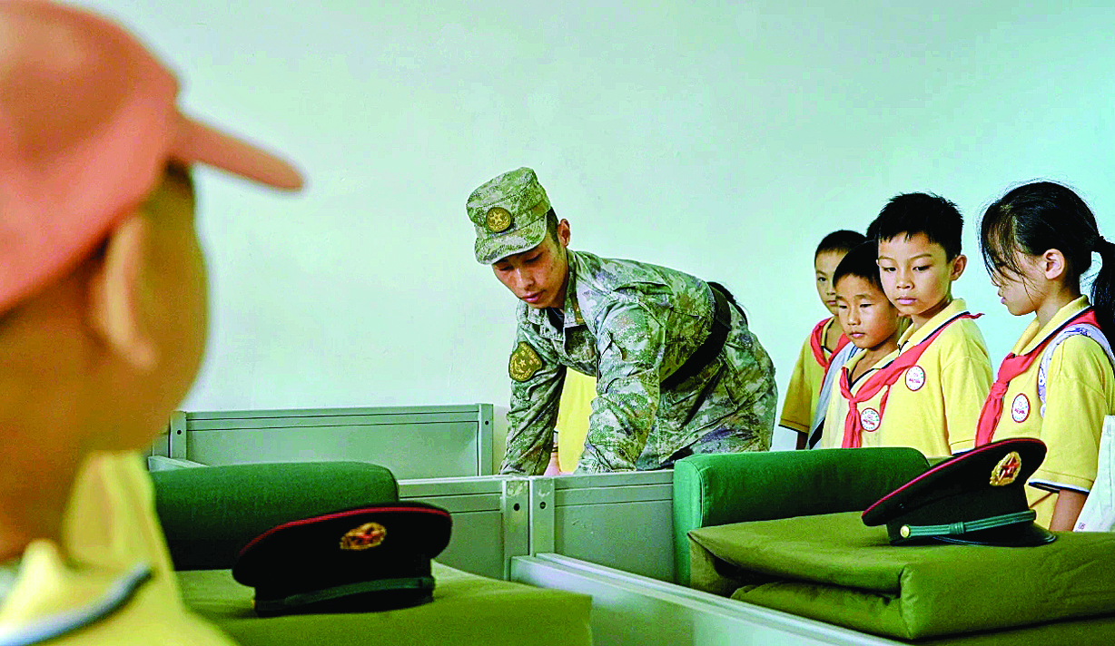 學(xué)生在軍營(yíng)觀摩疊被子。