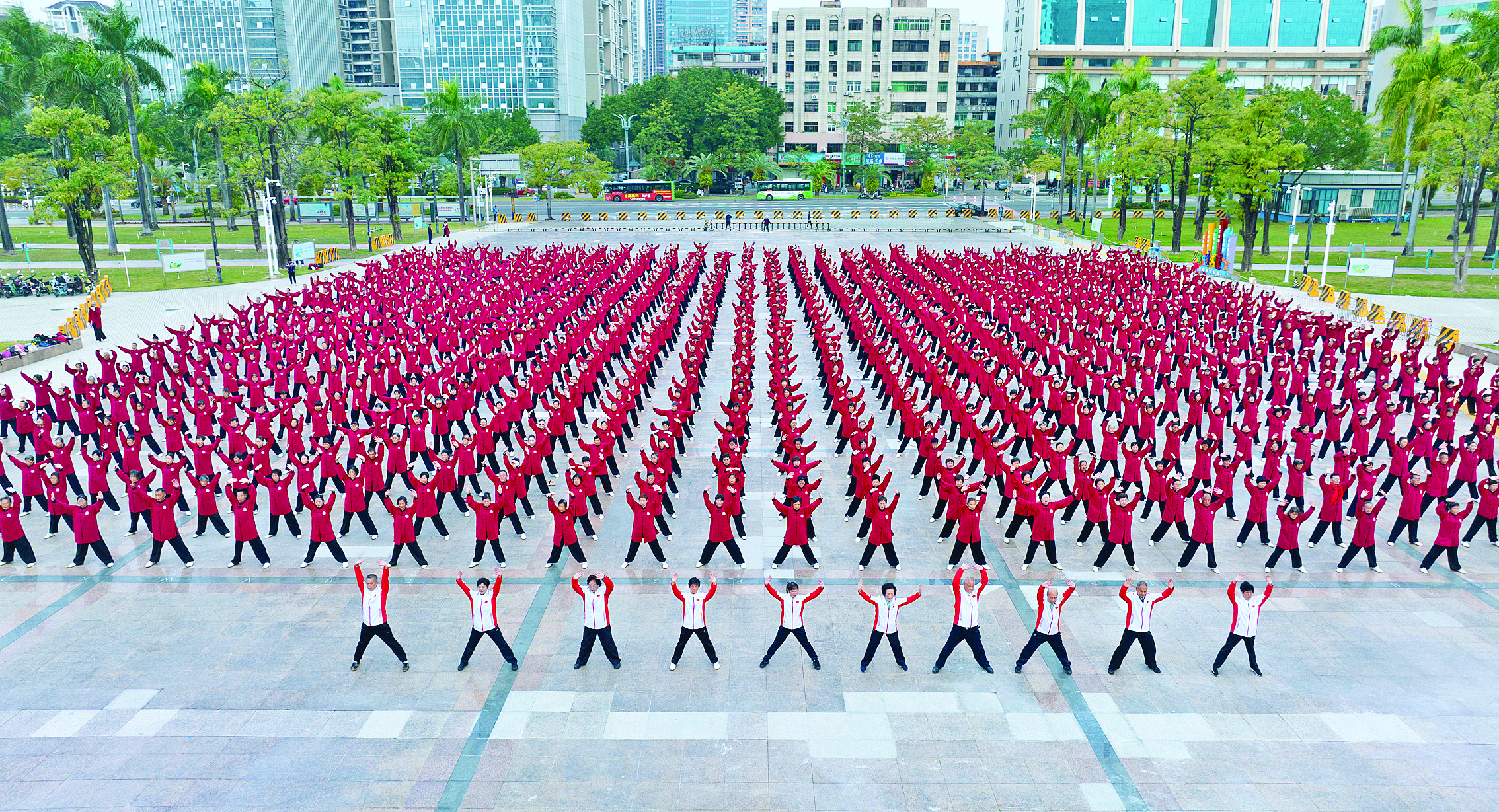 在惠州體育館廣場,千人舞太極場面壯觀。