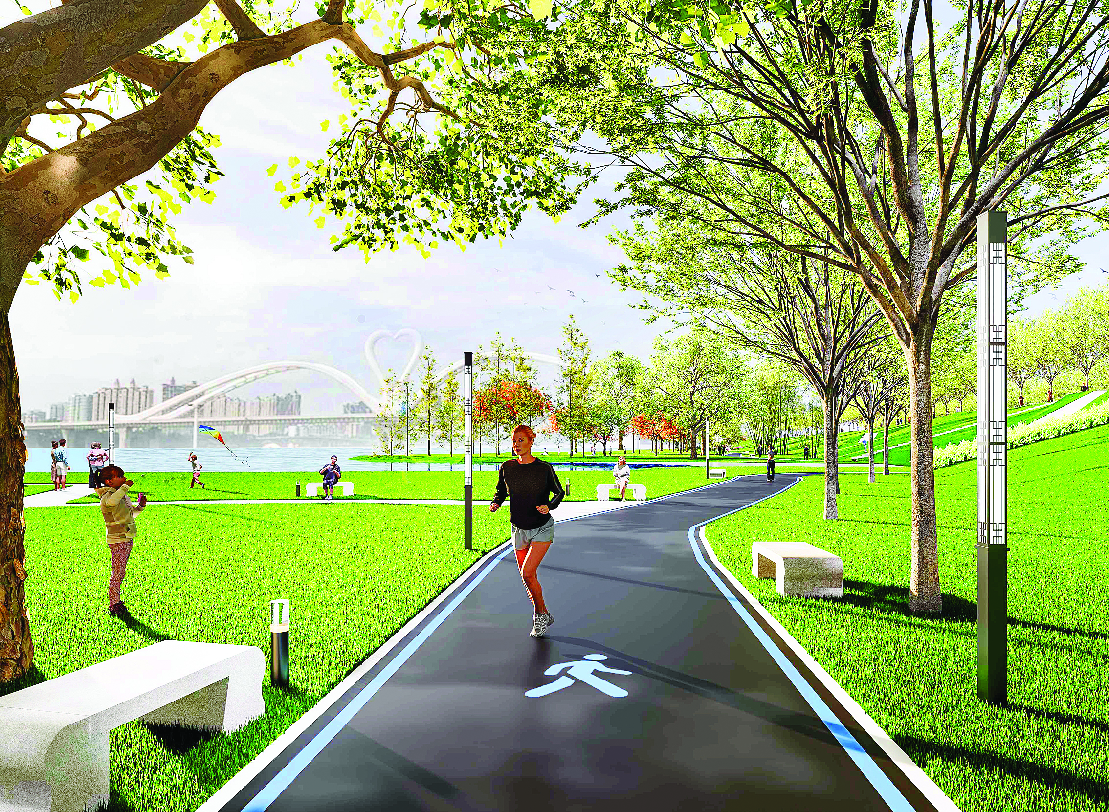規(guī)劃陽(yáng)光草坪、觀景平臺(tái)、橋下活動(dòng)區(qū)等