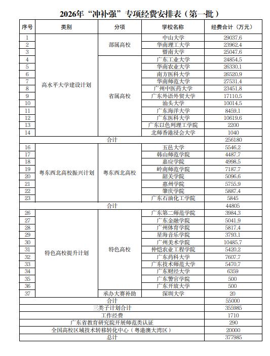 據(jù)公示消息,為加快構(gòu)建自強(qiáng)卓越的高等教育體系,不斷提升高校對高質(zhì)量發(fā)展的支撐力、貢獻(xiàn)力,結(jié)合各高校建設(shè)情況,廣東省教育廳研究制定了2026年高等教育“沖一流、補(bǔ)短板、強(qiáng)特色”專項(xiàng)資金安排方案(第一批,詳見附表)。現(xiàn)根據(jù)《廣東省省級財(cái)政專項(xiàng)資金管理辦法(2025年修訂)》(粵府〔2025〕56號)的有關(guān)規(guī)定,對經(jīng)費(fèi)安排予以公示,公示期自2025年12月24日至2025年12月31日,共7天。