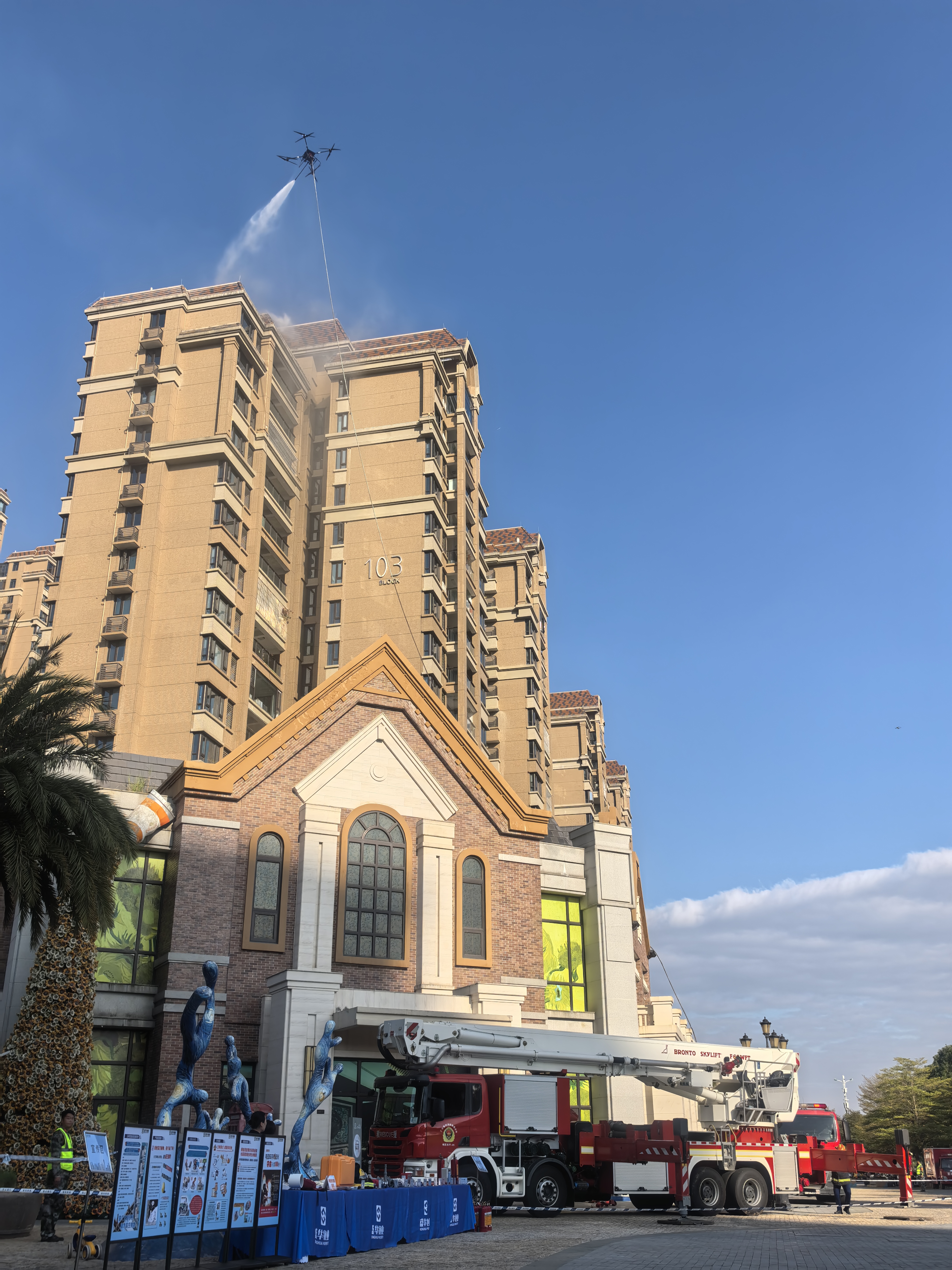 初期“火災(zāi)”撲救環(huán)節(jié),一架無人機(jī)迅速抵達(dá)模擬火災(zāi)樓棟上空,其搭載的高清攝像頭將現(xiàn)場(chǎng)每一處細(xì)節(jié)實(shí)時(shí)傳輸回地面指揮中心。隨著火勢(shì)擴(kuò)大,消防無人機(jī)快速升空,掛載著長(zhǎng)長(zhǎng)的消防水帶抵達(dá)人力難以企及的火災(zāi)核心區(qū)域。隨即水柱噴涌而出,直擊火點(diǎn),精準(zhǔn)展開前期火力壓制。同時(shí),屬地消防救援部門接警后迅速出動(dòng),在60米舉高噴射消防車和62米直臂登高平臺(tái)消防車等專業(yè)力量的救援下,“火災(zāi)”被徹底撲滅,“被困人員”安全獲救。