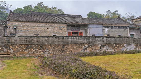 緊鄰著五經(jīng)魁,四德堂是一座客家傳統(tǒng)圍屋風(fēng)格的古建筑,始建于道光末年。四德堂坐西北朝東南,占地面積1500平方米,建筑格局為三進(jìn)二橫屋,兩側(cè)設(shè)有門樓。大門墻體以石塊鋪設(shè),門中設(shè)有兩個青石座,顏色青綠,紋理均勻,相傳石座取材于羅浮山深處。墻體繪有壁畫,封檐板木雕做工精細(xì)。至今,仍有后人在此居住,保存完好。