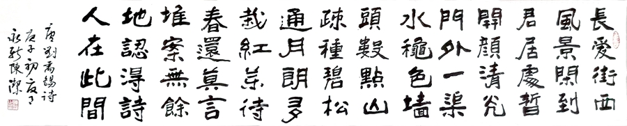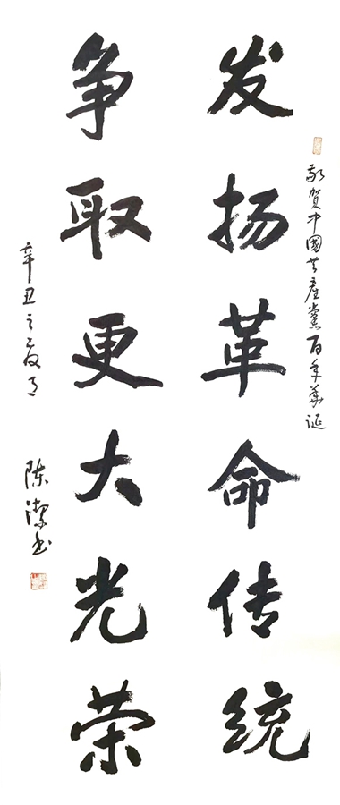在習(xí)書的過程中,陳潔一直堅(jiān)持向古人學(xué)習(xí),博采眾長。在臨帖時(shí),他會(huì)深入了解帖子創(chuàng)作當(dāng)時(shí)的背景、社會(huì)環(huán)境以及書法家當(dāng)時(shí)的創(chuàng)作狀態(tài)和人生經(jīng)歷,感受其創(chuàng)作的過程。“了解了帖子背后的東西,才能掌握該帖的文化精髓,對(duì)自己的學(xué)習(xí)和創(chuàng)作很有幫助。”現(xiàn)在,陳潔幾乎每晚都要在工作室練習(xí)書法2個(gè)小時(shí)以上。對(duì)他來說,練習(xí)書法既能修身養(yǎng)性,又能豐富自己。陳潔說,退休以后,他會(huì)把更多精力花在書法藝術(shù)上,希望到自己六十八九歲時(shí),能通過自己的勤奮努力,在書法理論和實(shí)踐上都上一個(gè)新的臺(tái)階。此外,他還將用更多時(shí)間服務(wù)社會(huì),參加文藝下鄉(xiāng)、文藝志愿服務(wù)等,推廣和傳承書法藝術(shù)。
