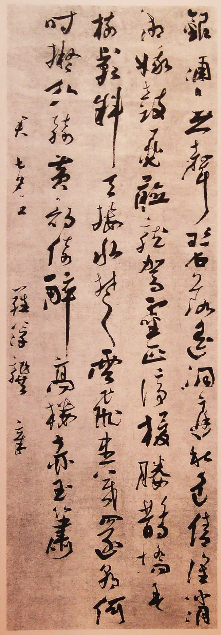 說到龔章書法淵源,論者多提及明末清初嶺南遺民書家彭睿瓘(號竹本)。對他的行草詩軸,林亞杰先生以為龔章“其書結(jié)體、草法,均與彭竹本相似”。(《廣東歷代書法圖錄》),陳永正先生更指其“拗折處取法彭竹本,而用筆飛騰變化之處,似更凌彭氏而上”,是“竹本派書家中最有成就”者(《嶺南書法史》)。廣州博物館藏彭氏書《七言詩二首》,第二首題為《送同人周藻思從章含五太史入都門》,可知彭睿瓘與龔章確曾有過交往,惜乎史料簡缺,二人具體關(guān)系以及其書法淵源目前尚難詳考。有意思的是,彭、龔二氏,都曾在清初嶺南書壇健筆縱橫,卻由于種種原因而埋沒草萊,幾乎成為歷史的“失蹤者”,現(xiàn)在竟又逐漸露出本真,走進人們的視線。天意如斯,令人感嘆。