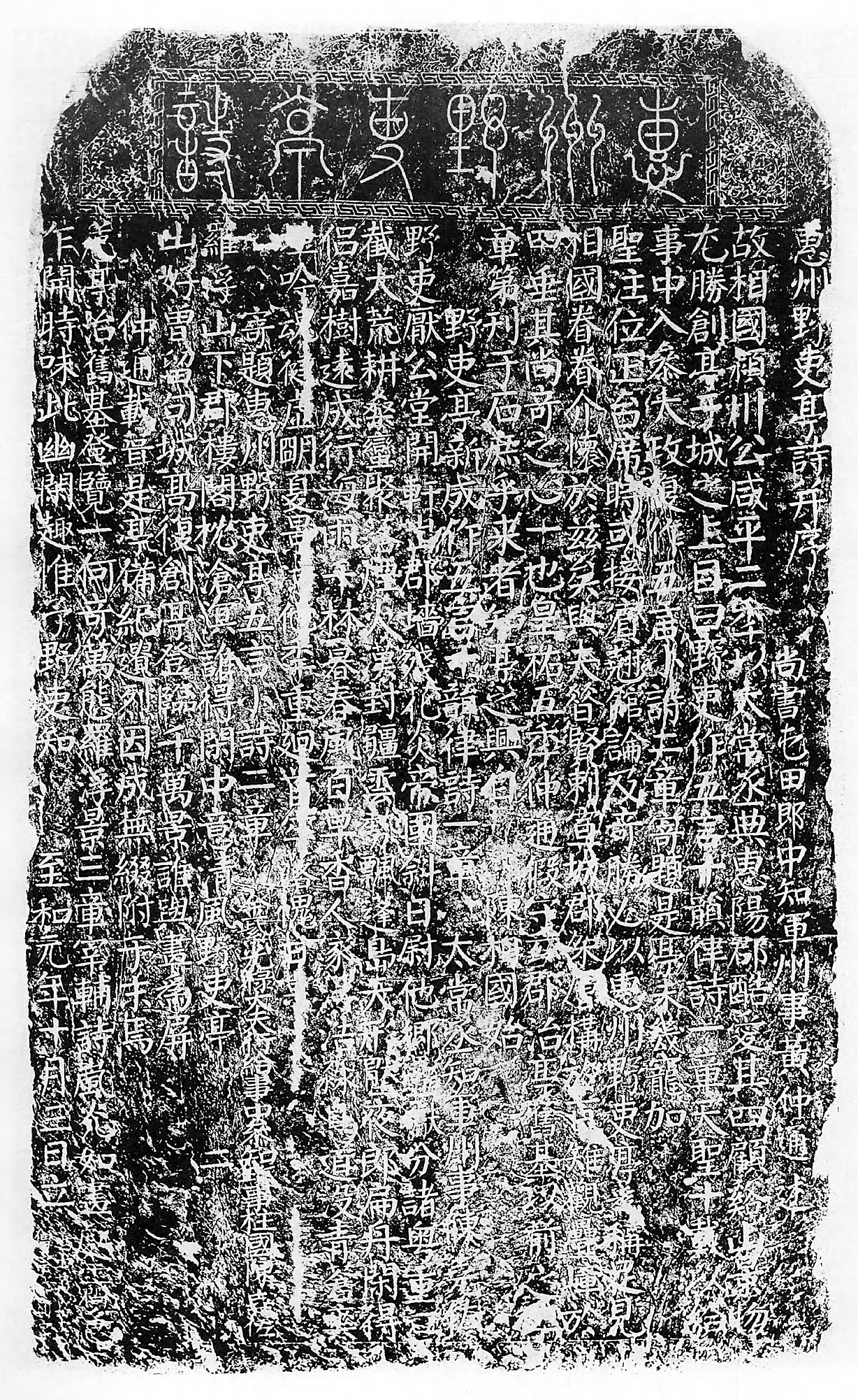 宋至和元年(1054),惠州太守黃仲通修葺野吏亭,將陳堯佐所賦五言詩(shī)三首并他所作之序、五言詩(shī)一首勒石,為“惠州野吏亭詩(shī)”碑,亦稱“黃碑”。
