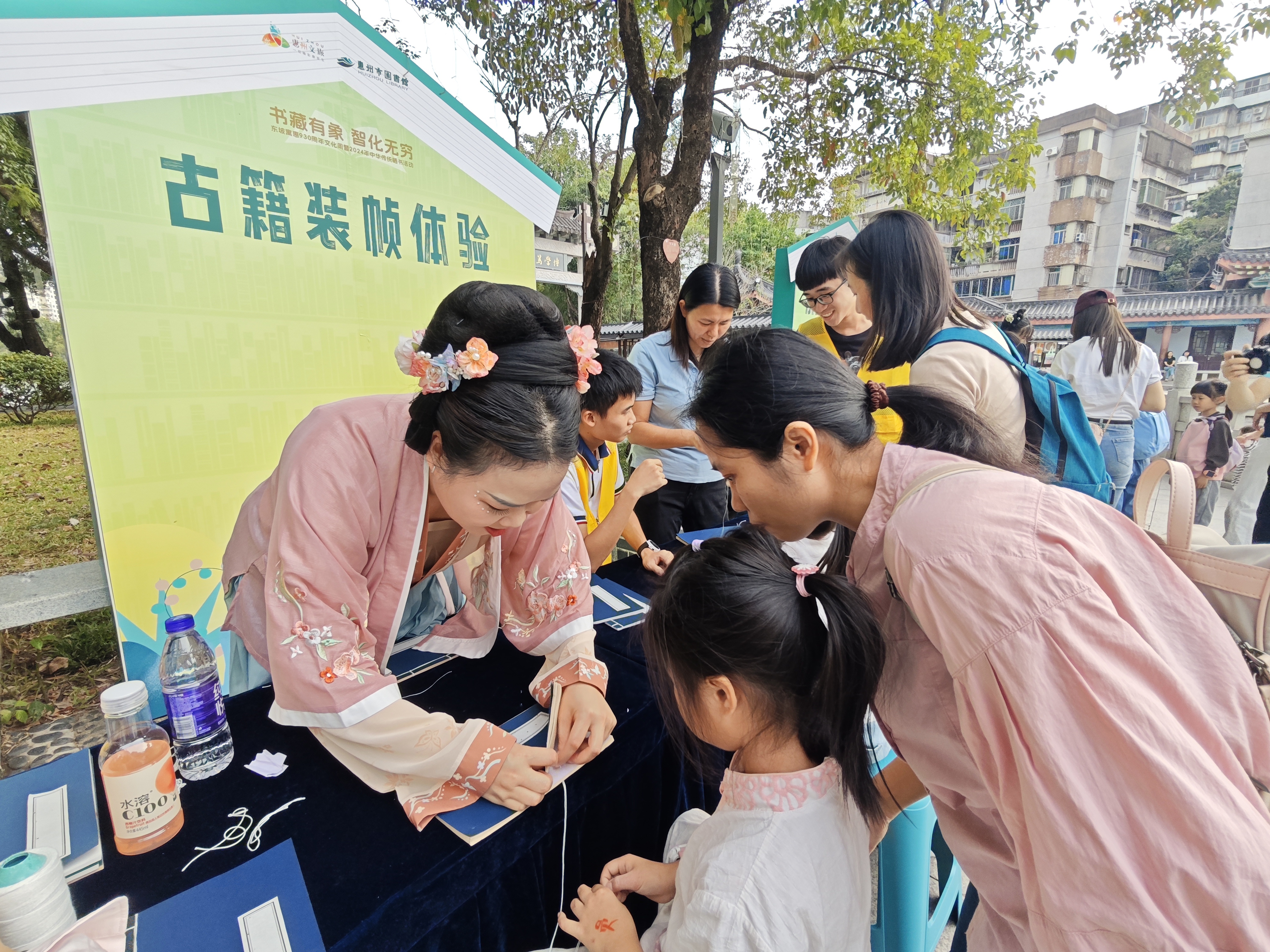 修身閣里,游客專心致志地聽館員講解東坡寓惠詩詞作品,并在誦讀中共同品味詩詞的韻律和情感。惠享書房內(nèi),參與者通過對東坡字帖的現(xiàn)場臨摹,感受東坡書法和詩詞作品的文化魅力。古籍修復(fù)體驗(yàn)區(qū)內(nèi),館員耐心地為市民游客講解并演示修復(fù)的原理、步驟、手法等基礎(chǔ)知識,然后讓游客親手體驗(yàn)破損書頁的修復(fù)。線裝書裝幀區(qū)域里,游客在館員的指導(dǎo)下量線、穿針、拉線,還可以將一本自己親自裝幀的線裝書帶回家。