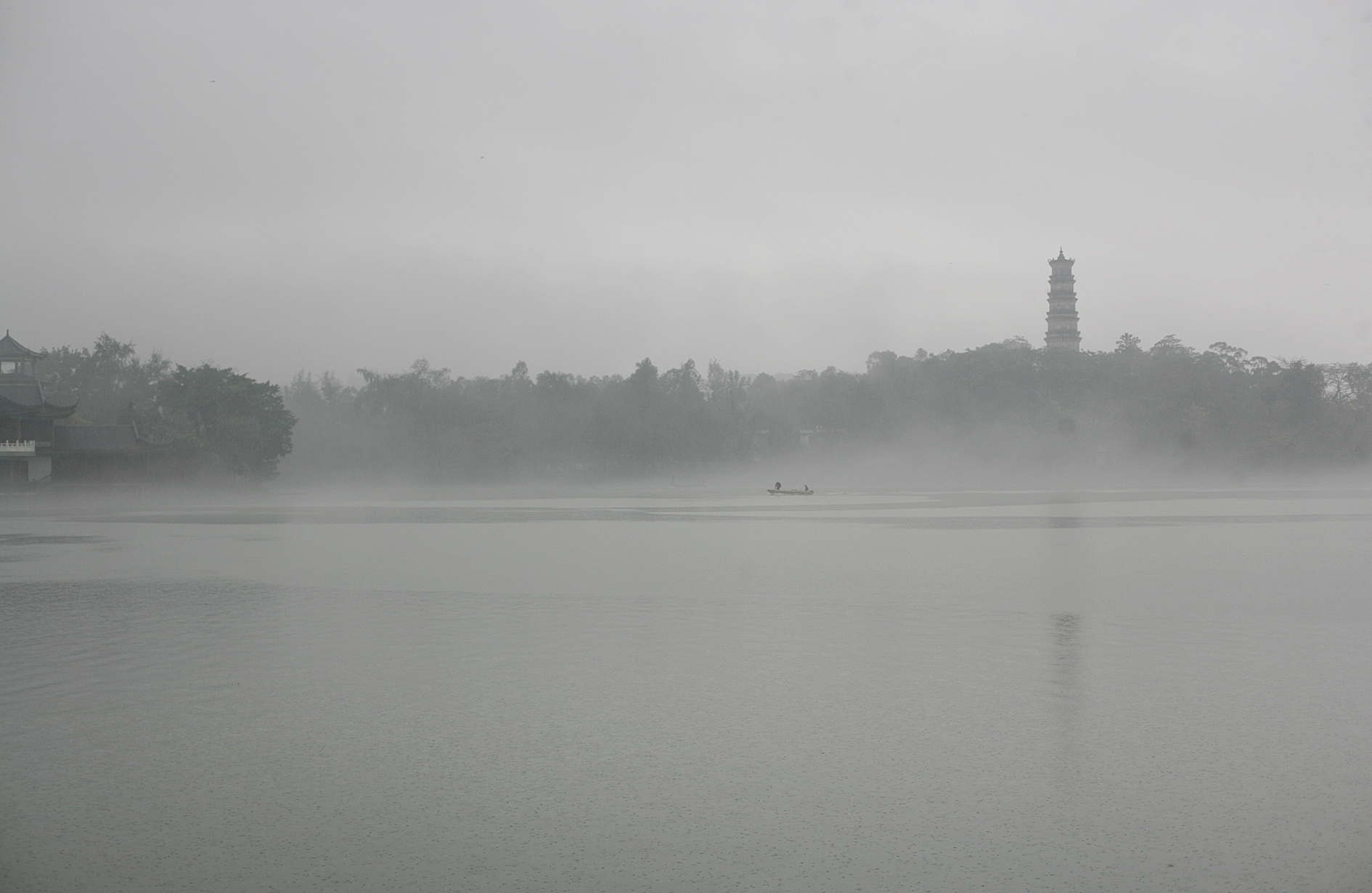 岸邊的柳樹被雨洗得發(fā)亮,柳條垂在水面,隨波輕輕晃動,像在與湖水說著悄悄話。幾個撐著油紙傘的游人沿著岸邊慢走,身影在雨霧中若隱若現(xiàn),倒成了畫里最生動的筆觸。忽然想起蘇軾寓居惠州時寫下的“日啖荔枝三百顆,不辭長作嶺南人”,當(dāng)年他或許也在這樣的雨天里漫步西湖,看雨打浮萍,聽浪拍堤岸,把人生的困頓融進(jìn)這湖水里,反倒沉淀出一份通透與豁達(dá)。