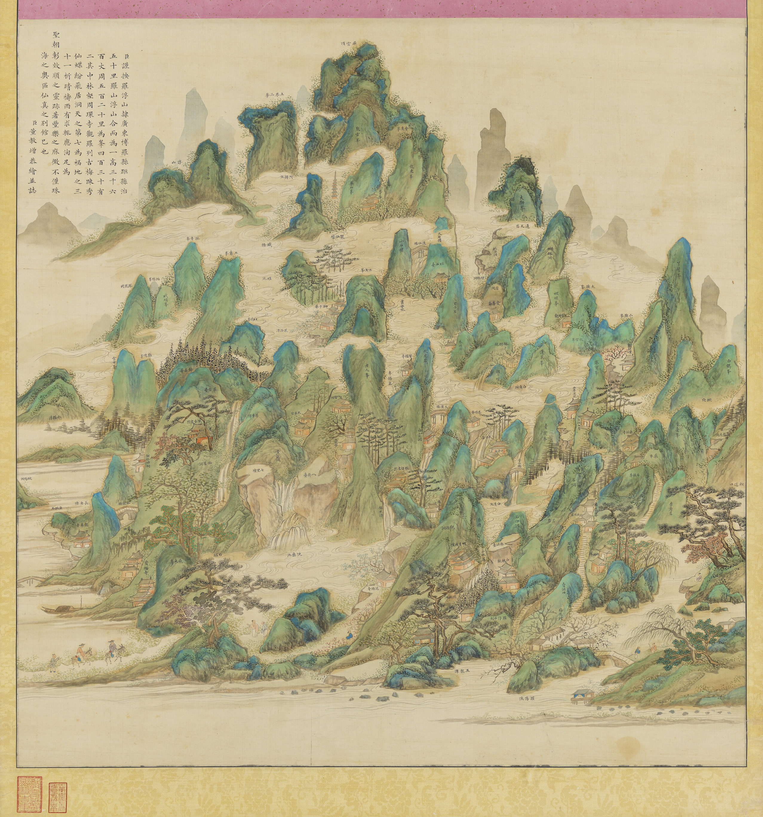 嘉慶二十二年(1817),廣東巡撫董教增離任,進(jìn)京考績。他擅長繪畫,曾游羅浮山,知道嘉慶帝對羅浮山很向往,特地繪制青綠山水《羅浮山圖》回京復(fù)命。