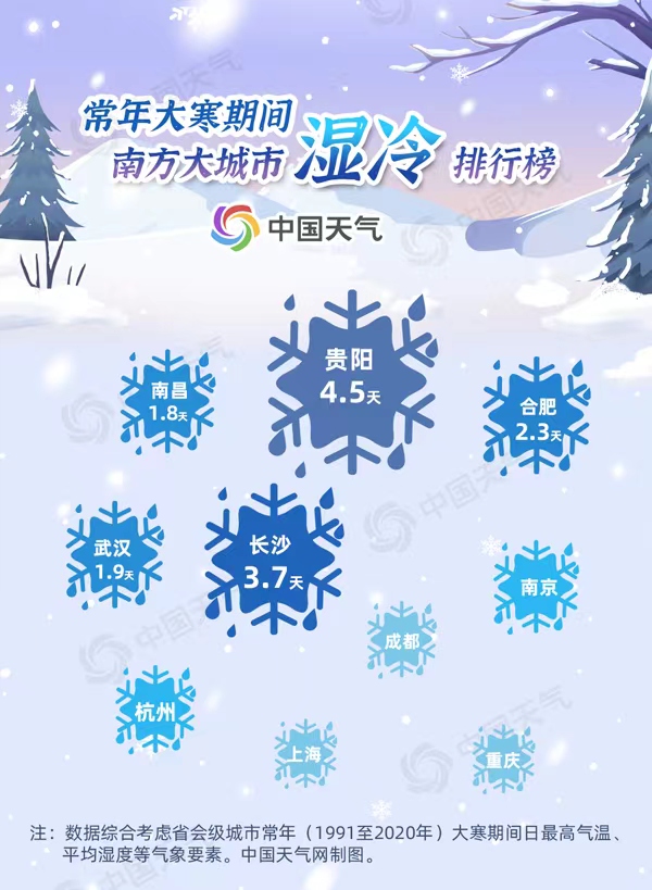 長(zhǎng)沙、合肥、武漢、南昌也是大寒期間濕冷的代表城市。冬日里,不到5℃甚至0℃左右的氣溫,伴隨著連日的雨雪,屋里屋外一樣冷,都是這些城市在大寒期間常常遭遇的情景。此外,江南地區(qū)的南京、杭州、上海和西南地區(qū)的成都、重慶也都在濕冷排行榜上有名。