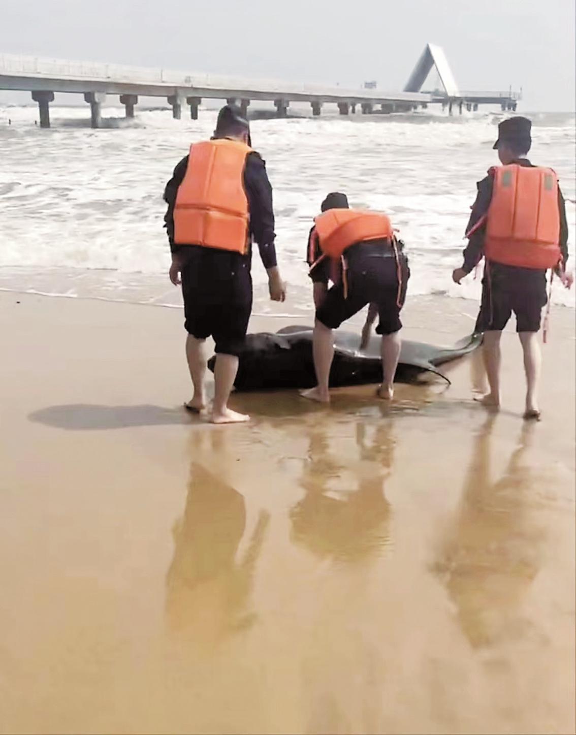 “鼎龍灣王村港海域有條大海豚擱淺,請(qǐng)趕快組織人員前來(lái)施救……”近日,湛江吳川市王村港鎮(zhèn)工作人員接到該市公安局110指揮中心轉(zhuǎn)來(lái)的信息后,立即組織10多人前往事發(fā)海域施救(見(jiàn)上圖),最終將海豚成功護(hù)送回大海。
