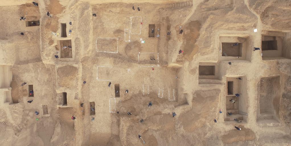 圖為河南三門峽陜州城墓地遺址發(fā)掘現(xiàn)場(chǎng)航拍圖。(三門峽市文物考古研究所供圖)