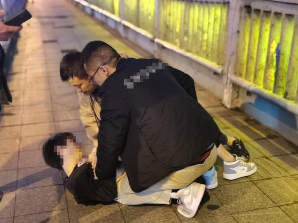 就在此時,那名招手者拉掉了對方的外套,對方趁機掙脫,爬向橋邊的護欄。情況危急,還沒等車開到跟前時,特警們便立即下車奔跑過去,迅速從機動車道翻越與人行道間隔的欄桿,和那名招手者一同拉住了輕生男子。
