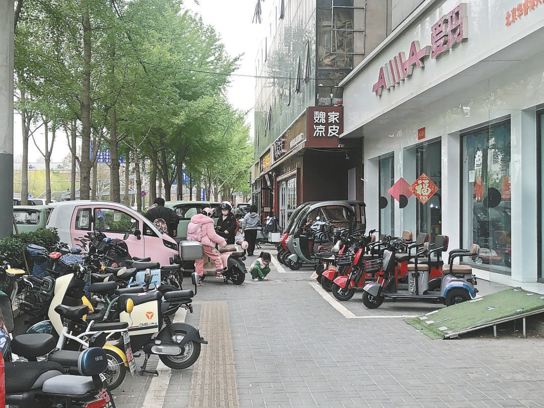 在多位家長(zhǎng)的指引下,記者來到了附近的新華南路,路西側(cè)有多家電動(dòng)車行。待出售的電動(dòng)三輪車占滿了店門前的便道,令人眼花繚亂,不少準(zhǔn)備購車的顧客正在聽商家“解讀”購車和駕駛方面的法律法規(guī)。