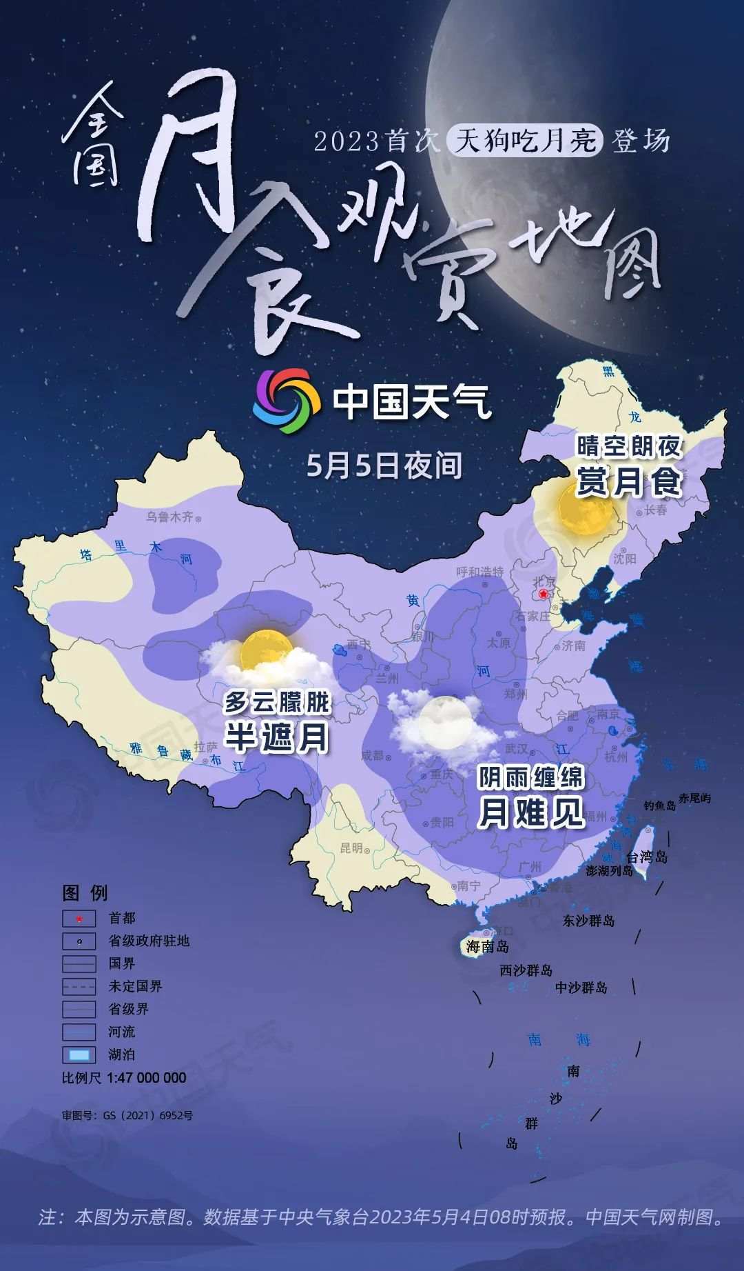 今晚(5月5日)我國“星月劇場”將上演一場天狗吃月亮的大戲,這是2023年首次月食,也是一次半影月食。屆時,月亮將表演“變臉”絕技。從天文角度來說,這次月食我國全域都可見全程,因此天氣陰晴成為賞半影月食的關(guān)鍵。中國天氣網(wǎng)推出全國月食觀賞地圖,看你家能否看見月亮“變臉”。