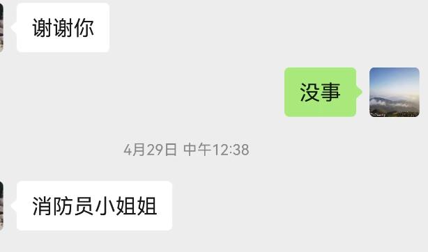 后來,小伙給周穎發(fā)了一條微信說,謝謝消防員姐姐。