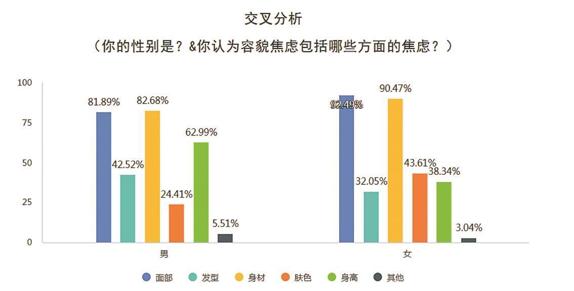 雖然男女對容貌的關注重點不同,但大多數(shù)受訪大學生認為面部(90.32%)、身材(88.87%)對容貌焦慮而言最重要,其次是身高、膚色、發(fā)型。男生女生對容貌的關注重點不同,男生的關注更傾向于身材(82.68%),而女生更在意面部(92.49%)。