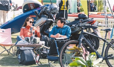 圖為兩名游客在露營(yíng)裝備展區(qū)交流。唐旭騁攝(人民視覺(jué))