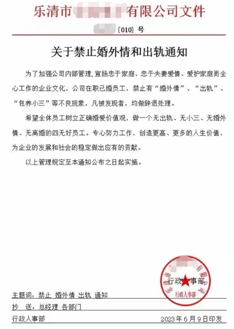 近日,一張溫州樂清市某企業(yè)“關(guān)于禁止婚外情和出軌通知”的圖片在網(wǎng)上流傳:“為了加強(qiáng)公司內(nèi)部管理,宣揚(yáng)忠于家庭、忠于夫妻愛情、愛護(hù)家庭而全心工作的企業(yè)文化,公司在職已婚員工,禁止有‘婚外情’‘出軌’‘包養(yǎng)小三’等不良現(xiàn)象,凡被發(fā)現(xiàn)者,均做辭退處理。希望全體員工樹立正確婚愛價(jià)值觀,做一個(gè)無(wú)出軌、無(wú)小三、無(wú)婚外情、無(wú)離婚的四無(wú)好員工。專心努力工作,創(chuàng)造更高、更多的人生價(jià)值,為企業(yè)的發(fā)展和社會(huì)的穩(wěn)定做出應(yīng)有的貢獻(xiàn)。”圖片顯示,該通知由企業(yè)行政人事部2023年6月9日印發(fā)。
