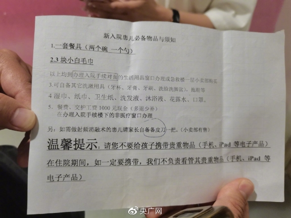 一病人出示的入院提示單顯示“交護工費1000元”(央廣網記者 汪寧 攝)