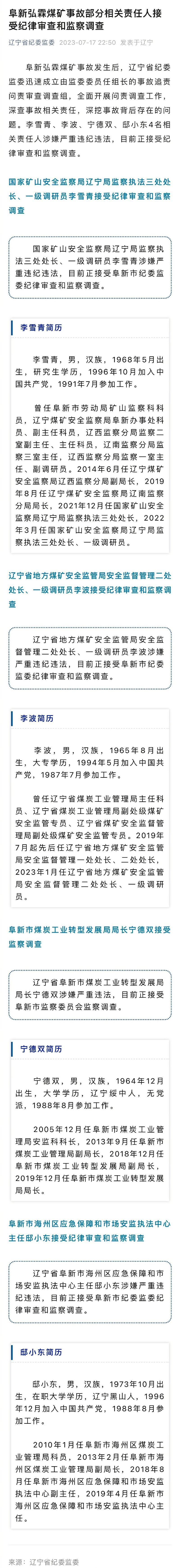 遼寧省紀(jì)委監(jiān)委微信公眾號(hào)7月17日通報(bào),阜新弘霖煤礦事故發(fā)生后,遼寧省紀(jì)委監(jiān)委迅速成立由監(jiān)委委員任組長的事故追責(zé)問責(zé)審查調(diào)查組,全面開展問責(zé)調(diào)查工作,深查事故相關(guān)責(zé)任,深挖事故背后存在的問題。李雪青、李波、寧德雙、邸小東4名相關(guān)責(zé)任人涉嫌嚴(yán)重違紀(jì)違法,目前正接受紀(jì)律審查和監(jiān)察調(diào)查。
