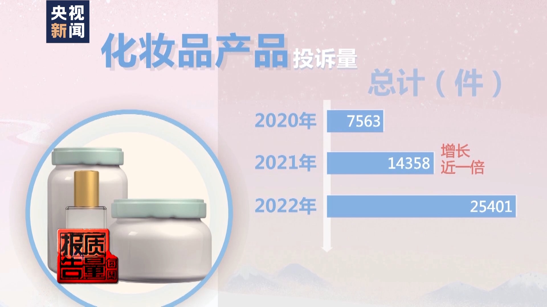 中國消費者協(xié)會提供給記者的數(shù)據(jù)顯示,2020年至2022年有關(guān)化妝品產(chǎn)品投訴量呈明顯上升趨勢。2020年有關(guān)化妝品產(chǎn)品投訴總計7563件,2021年有關(guān)化妝品產(chǎn)品投訴總計14358件,增長了近一倍,到了2022年,投訴量就增長到了25400多件(25401件)。