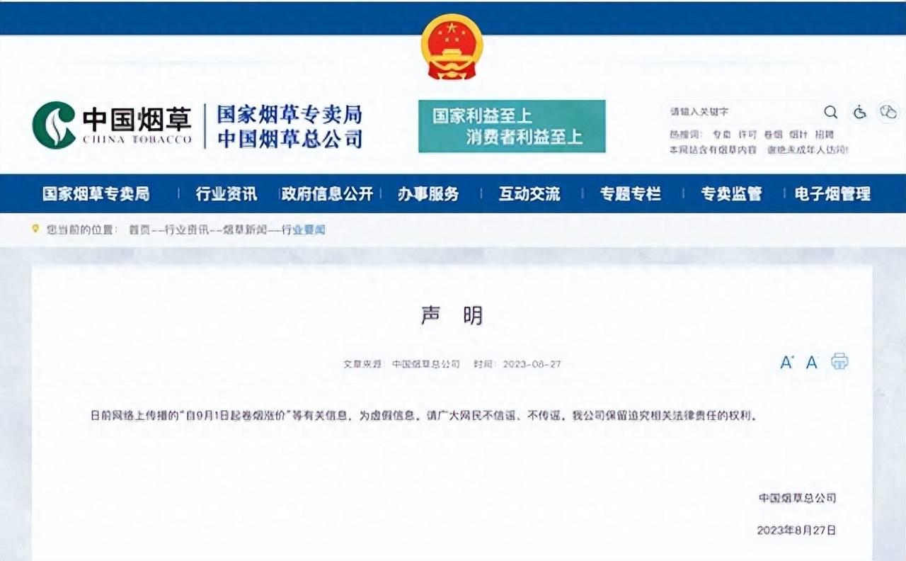 央視網消息:據中國煙草總公司網站消息,日前網絡上傳播的“自9月1日起卷煙漲價”等有關信息,為虛假信息。請廣大網民不信謠、不傳謠。中國煙草總公司保留追究相關法律責任的權利。