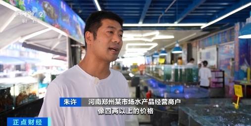 在河南鄭州一家農(nóng)產(chǎn)品交易市場的水產(chǎn)區(qū),每個(gè)攤位前都擺滿了梭子蟹、皮皮蝦、石斑魚等海鮮產(chǎn)品。