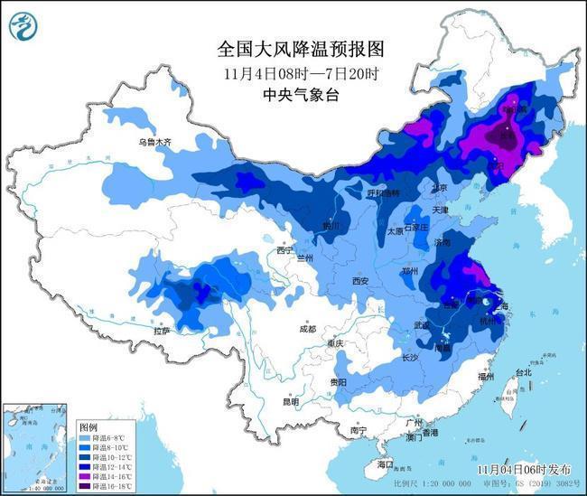 中央氣象臺11月4日06時(shí)繼續(xù)發(fā)布寒潮藍(lán)色預(yù)警:
