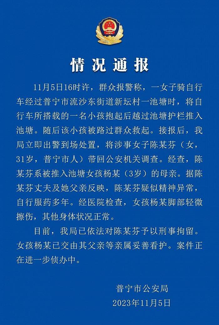 央視網(wǎng)消息:據(jù)“普寧警訊”公眾號通報,11月5日16時許,群眾報警稱,一女子騎自行車經過普寧市流沙東街道新壇村一池塘時,將自行車所搭載的一名小孩抱起后越過池塘護欄推入池塘。隨后該小孩被路過群眾救起。接報后,警方立即出警到場處置,將涉事女子陳某芬(女,31歲,普寧市人)帶回公安機關調查。經查,陳某芬系被推入池塘女孩楊某(3歲)的母親。據(jù)陳某芬丈夫及她父親反映,陳某芬疑似精神異常,自行服藥多年。經醫(yī)院檢查,女孩楊某腳部輕微擦傷,其他身體狀況正常。