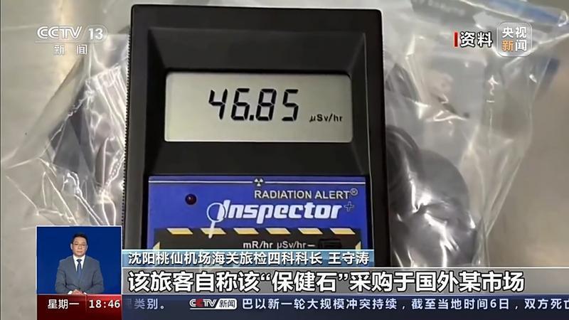 沈陽桃仙機(jī)場海關(guān)旅檢四科科長 王守濤:一旅客通過我身后的固定式核輻射監(jiān)測門觸發(fā)報警,經(jīng)過我們復(fù)查確認(rèn),該旅客隨身攜帶的“保健石”項鏈核輻射超標(biāo),經(jīng)過測量輻射值達(dá)到46.85微西弗/小時,超現(xiàn)場本底值468倍。該旅客自稱該“保健石”采購于國外某市場,賣家稱該保健石具有養(yǎng)生保健、防病防癌、延年益壽的功效。