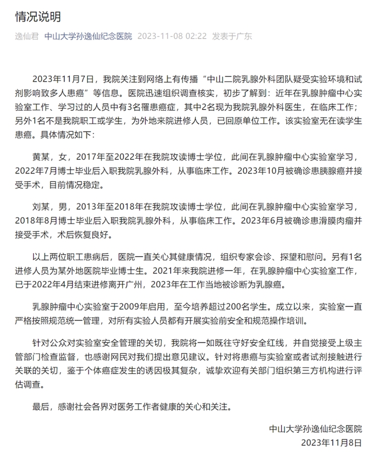 11月8日2時(shí)22分,中山大學(xué)孫逸仙紀(jì)念醫(yī)院(中山大學(xué)附屬第二醫(yī)院)微信公眾號(hào)發(fā)布情況通報(bào),回應(yīng)“中山二院乳腺外科團(tuán)隊(duì)疑受實(shí)驗(yàn)環(huán)境和試劑影響致多人患癌”等信息,全文如下: