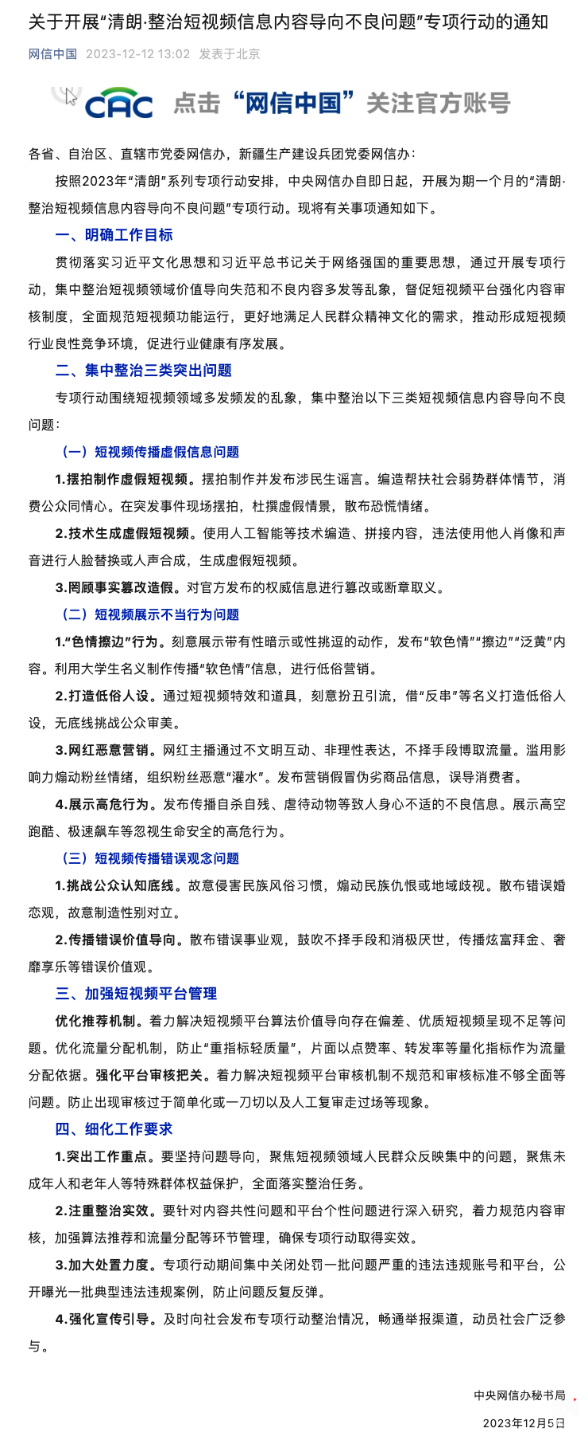 12月12日,據(jù)“網(wǎng)信中國”微信公眾號消息,中央網(wǎng)信辦自即日起,開展為期一個月的“清朗·整治短視頻信息內(nèi)容導(dǎo)向不良問題”專項行動,其中,短視頻傳播虛假信息的問題被列為本次行動重點(diǎn)整治對象。網(wǎng)信辦還表示,將集中打擊杜撰虛假情景、散布恐慌情緒、傳播消極厭世價值觀的視頻亂象。