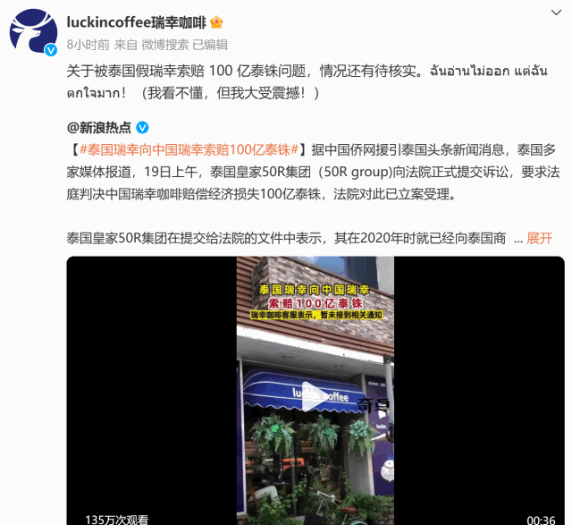 不僅敗訴,還被“泰國(guó)瑞幸”反訴賠償100億泰銖(約合人民幣20億元)。