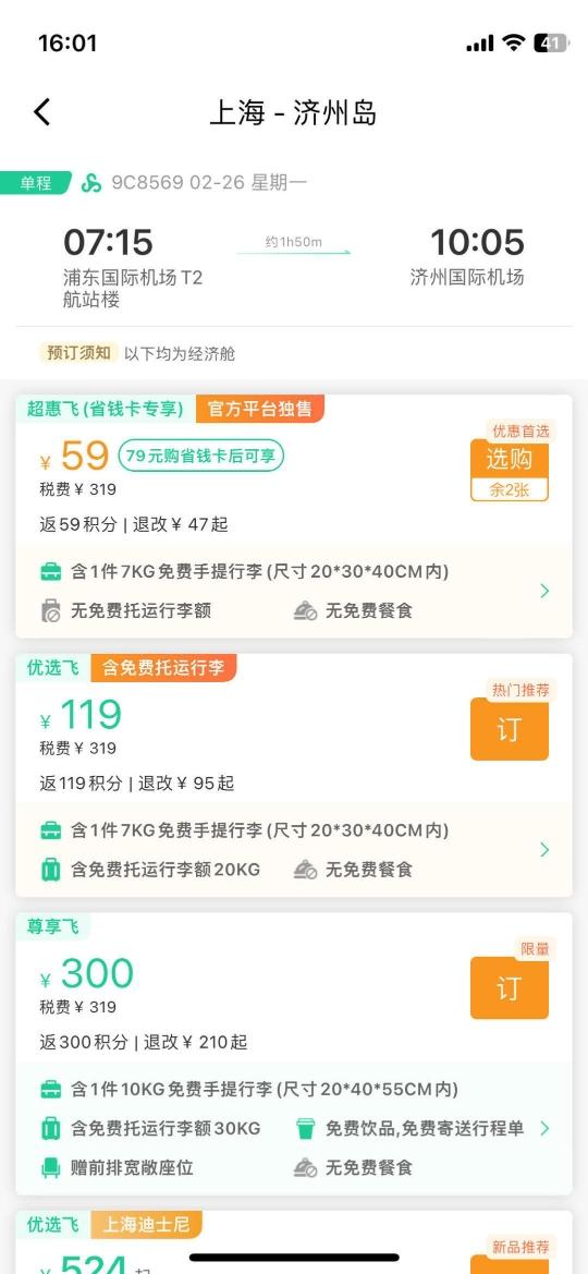“上海飛大阪機(jī)票僅8元”的話題,于2月20日沖上微博熱搜。2月20日下午,記者通過春秋航空APP發(fā)現(xiàn),近期從上海飛往日本大阪、新加坡、韓國濟(jì)州島在內(nèi)的多條出發(fā)航線的不含稅票價(jià)都很低。以2月26日上海飛濟(jì)州島為例,記者查詢了解到,單程不含稅最低價(jià)格為59元,稅費(fèi)為319元,但是要享受此價(jià)格需額外花費(fèi)79元購“省錢卡”后才能享受。