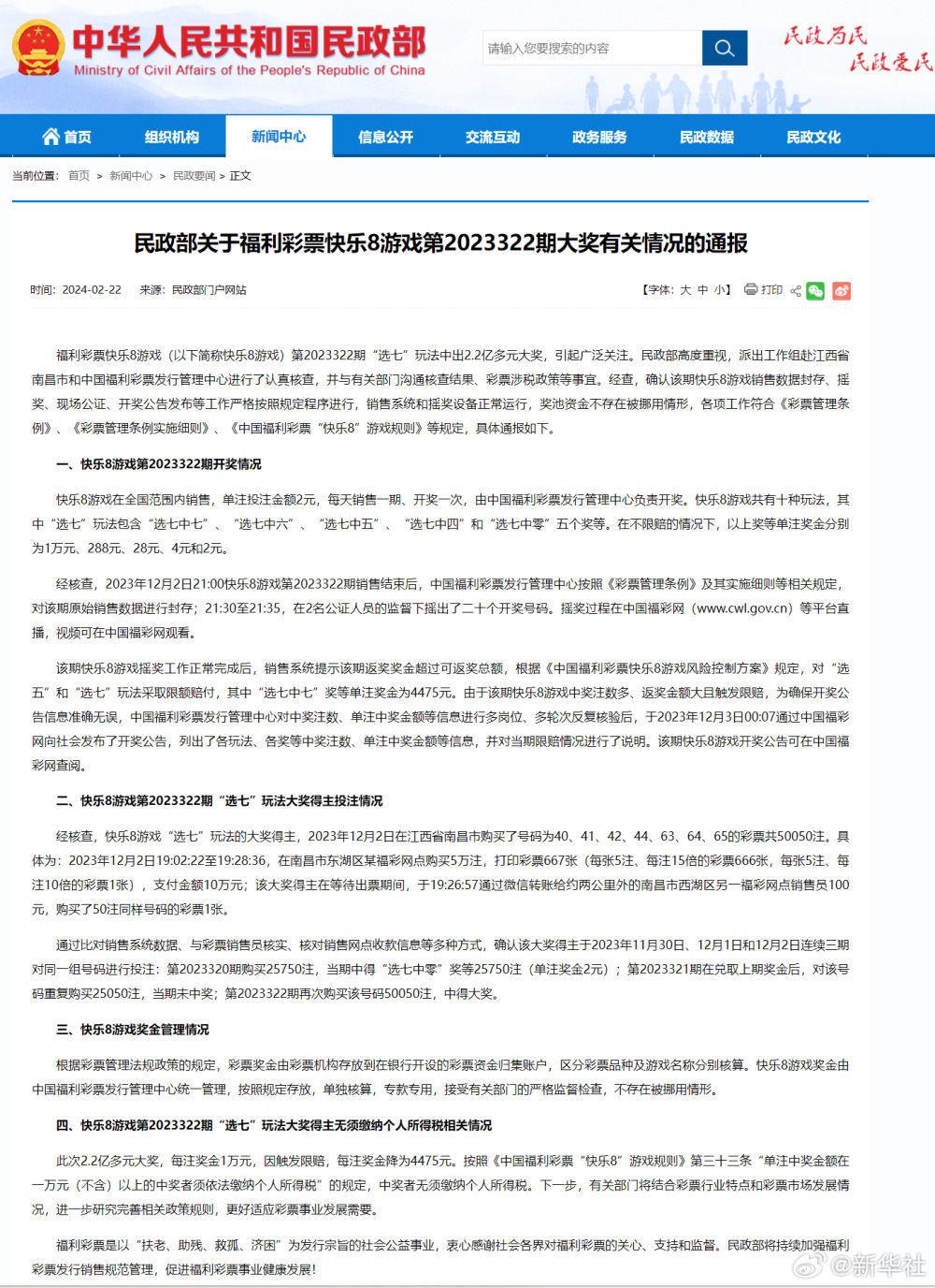 福利彩票快樂8游戲(以下簡(jiǎn)稱快樂8游戲)第2023322期“選七”玩法中出2.2億多元大獎(jiǎng),引起廣泛關(guān)注。民政部高度重視,派出工作組赴江西省南昌市和中國(guó)福利彩票發(fā)行管理中心進(jìn)行了認(rèn)真核查,并與有關(guān)部門溝通核查結(jié)果、彩票涉稅政策等事宜。經(jīng)查,確認(rèn)該期快樂8游戲銷售數(shù)據(jù)封存、搖獎(jiǎng)、現(xiàn)場(chǎng)公證、開獎(jiǎng)公告發(fā)布等工作嚴(yán)格按照規(guī)定程序進(jìn)行,銷售系統(tǒng)和搖獎(jiǎng)設(shè)備正常運(yùn)行,獎(jiǎng)池資金不存在被挪用情形,各項(xiàng)工作符合《彩票管理?xiàng)l例》、《彩票管理?xiàng)l例實(shí)施細(xì)則》、《中國(guó)福利彩票“快樂8”游戲規(guī)則》等規(guī)定,具體通報(bào)如下。