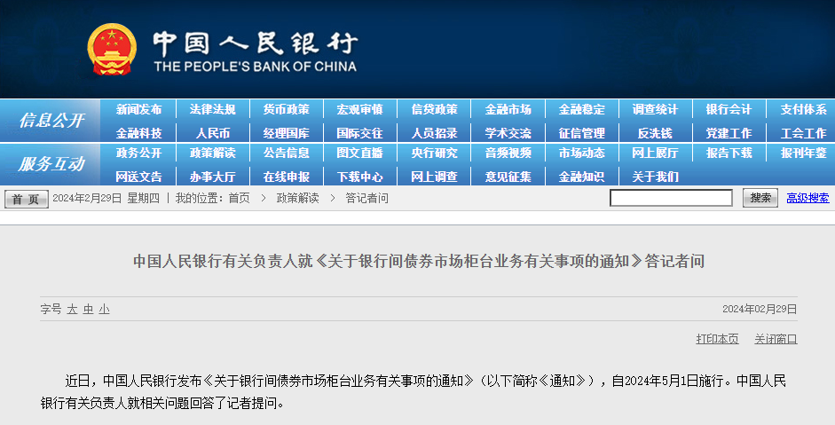 2月29日,中國人民銀行官網發(fā)布消息,近日,中國人民銀行發(fā)布《關于銀行間債券市場柜臺業(yè)務有關事項的通知》(以下簡稱《通知》),自2024年5月1日施行。中國人民銀行有關負責人就相關問題回答了記者提問。