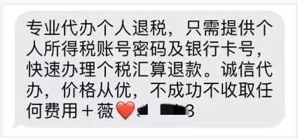 騙子會(huì)通過(guò)電話或者短信:“只要提供個(gè)稅APP賬號(hào)密碼和銀行卡號(hào),我們就可以幫忙操作辦理個(gè)稅匯算退稅,按退稅到賬金額比例支付服務(wù)費(fèi),若沒(méi)有成功不收取費(fèi)用!”